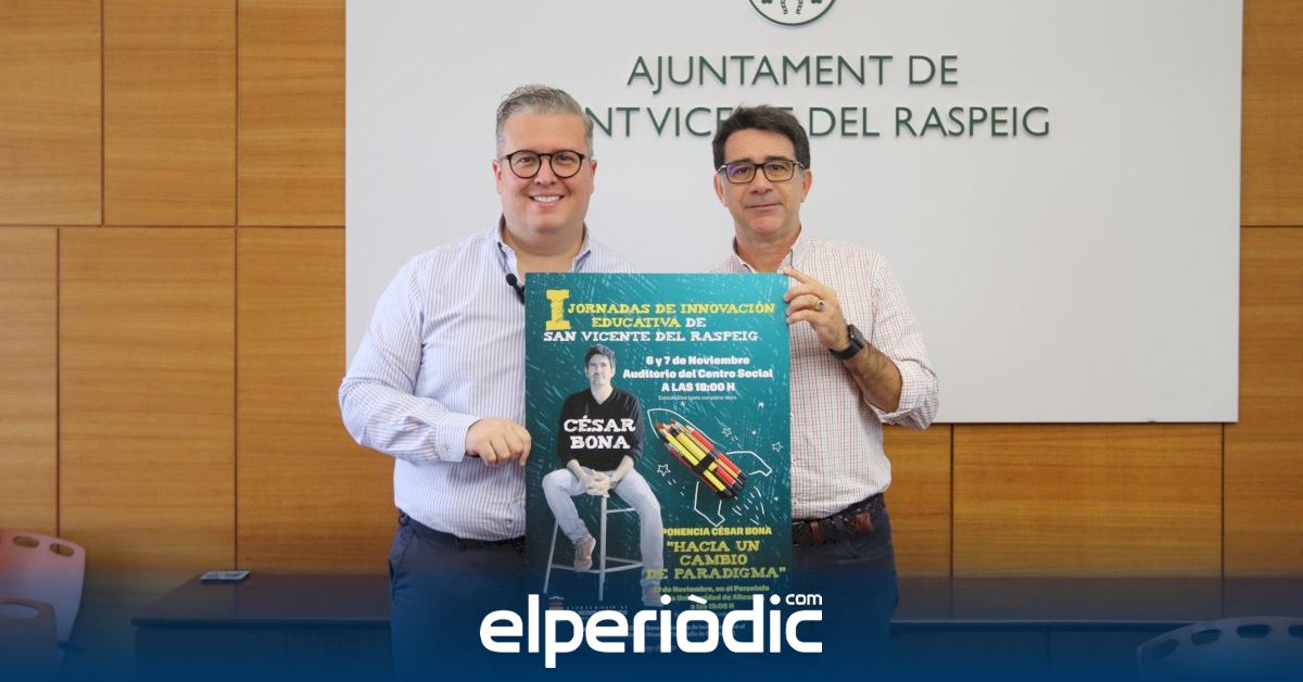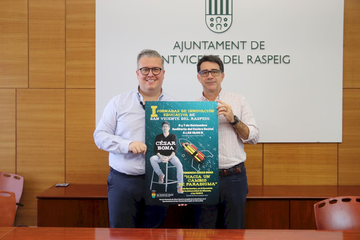 El Ayuntamiento estrena las I Jornadas de Innovación Educativa de San Vicente del Raspeig, una iniciativa pionera con la que se pretende compartir diferentes proyectos pedagógicos y metodológicos de éxito que se realizan en los distintos centros educativos del municipio. El encuentro comenzará los próximos lunes y martes, 6 y 7 de noviembre, y se clausurará el día 13 con una ponencia magistral del prestigioso maestro y escritor César Bona.