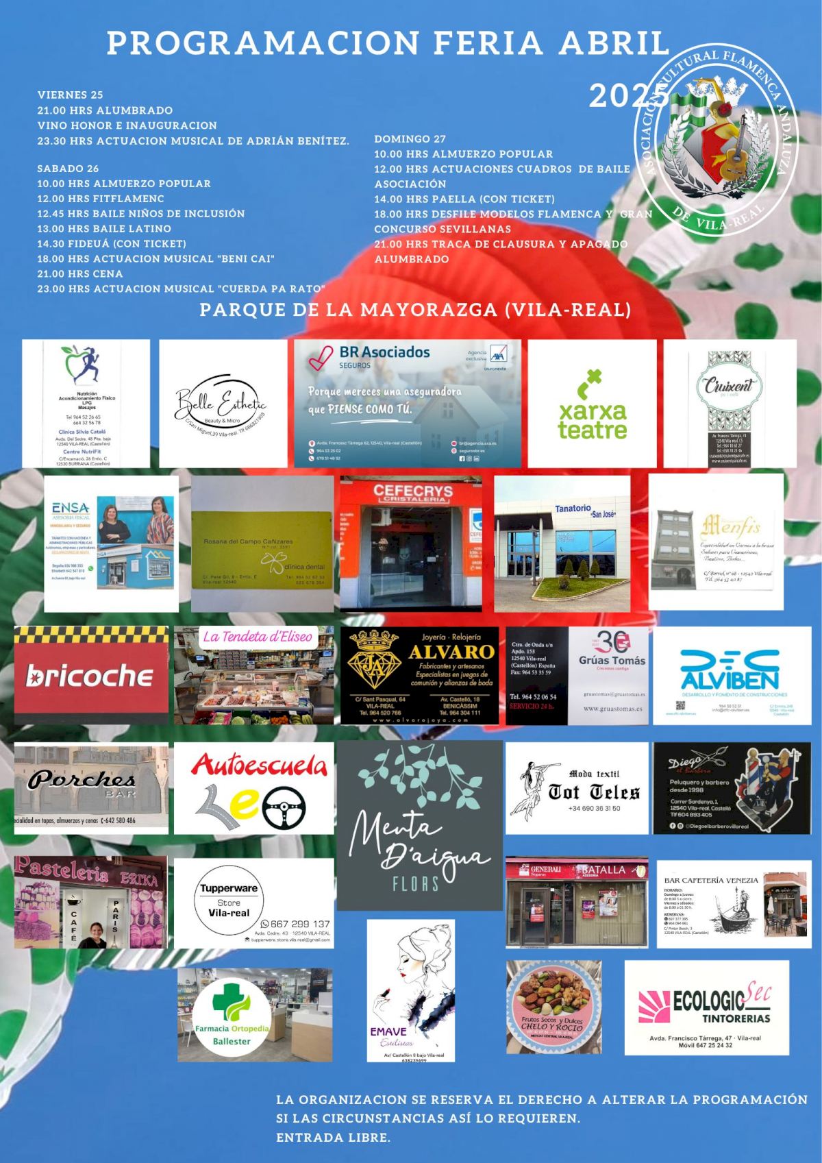 La programación se inaugurará el viernes con el encendido del alumbrado, a las 21.00 horas, y continuará con la actuación musical de La mar de flamenca, a las 23.30 horas. El sábado, los actos empezarán a las 12.00 horas con FITFlamenc seguido de dos sesiones de baile, una para la inclusión de niños a las 12.45 y una de bailes latinos a las 13.00; una fideuá a las 14.30; la actuación musical Beni Cai a las 18.00 horas; la cena y la actuación de Cuerda pa’ rato, a las 23.00 horas, completan la jornada sabatina. La última jornada, la de domingo, empezará con un almuerzo popular a las 10.00, a mediodía tendrán lugar las actuaciones de los cuadros de baile de la asociación, a las 14.00 está prevista la comida para retomar la actividad a las 18.00 horas con un desfile de moda flamenca y un concurso de sevillanas y, como conclusión de esta edición, a las 21.00 horas se lanzará una traca y se apagará el alumbrado.