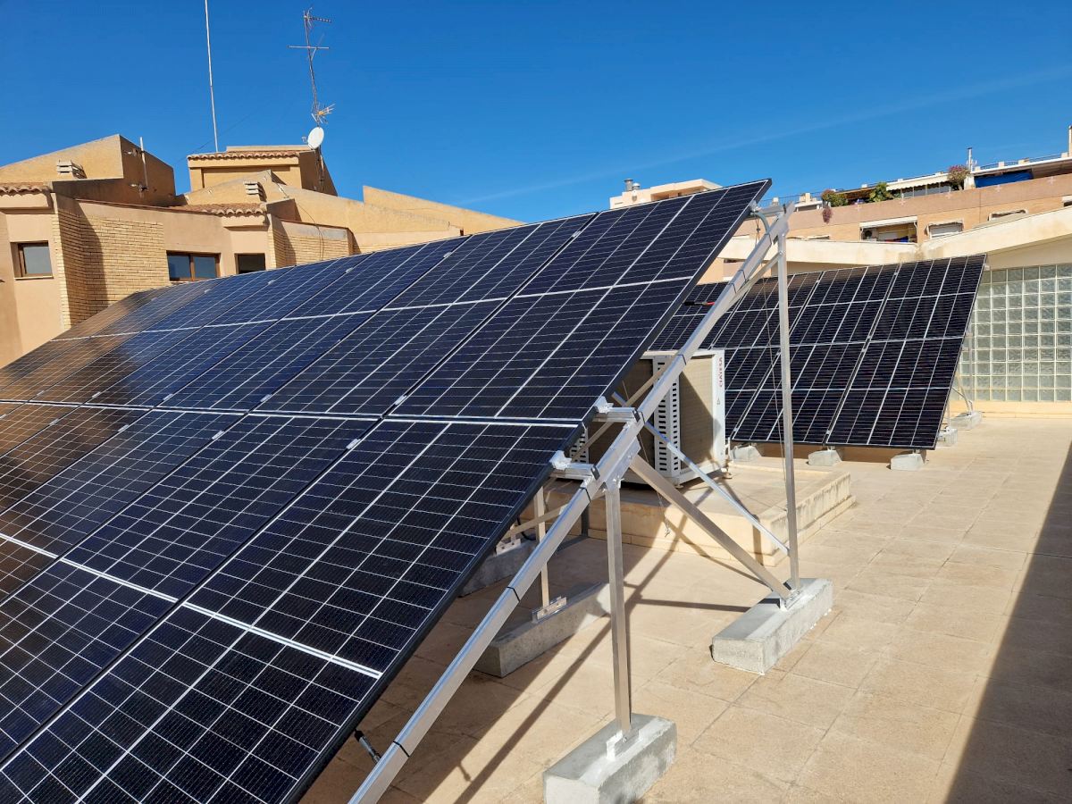 Los módulos solares se han instalado en la cubierta plana del Centro de Día Fundación Aragonés, con soportes de hormigón prefabricado tipo "lastre", integrándose de forma discreta en el edificio.