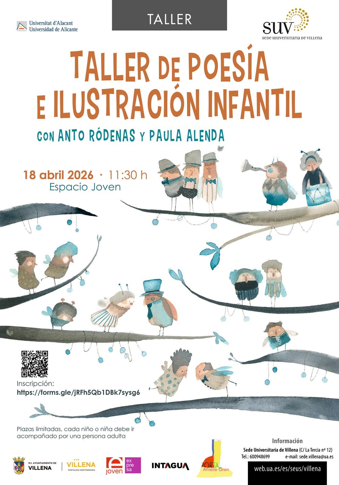 La programación se inicia con el Taller de Poesía e Ilustración Infantil, que se celebrará el próximo sábado 18 de abril a las 11.30 horas en el Espacio Joven. Esta actividad estará impartida por Antonia Rodenas y Paula Alenda, y está pensada para estimular la creatividad literaria y artística de los más jóvenes en un entorno participativo y dinámico. Para asistir es necesario inscribirse mediante un formulario (https://forms.gle/jRFh5Qb1DBk7sysg6 ), disponible en la web de la Sede Universitaria.