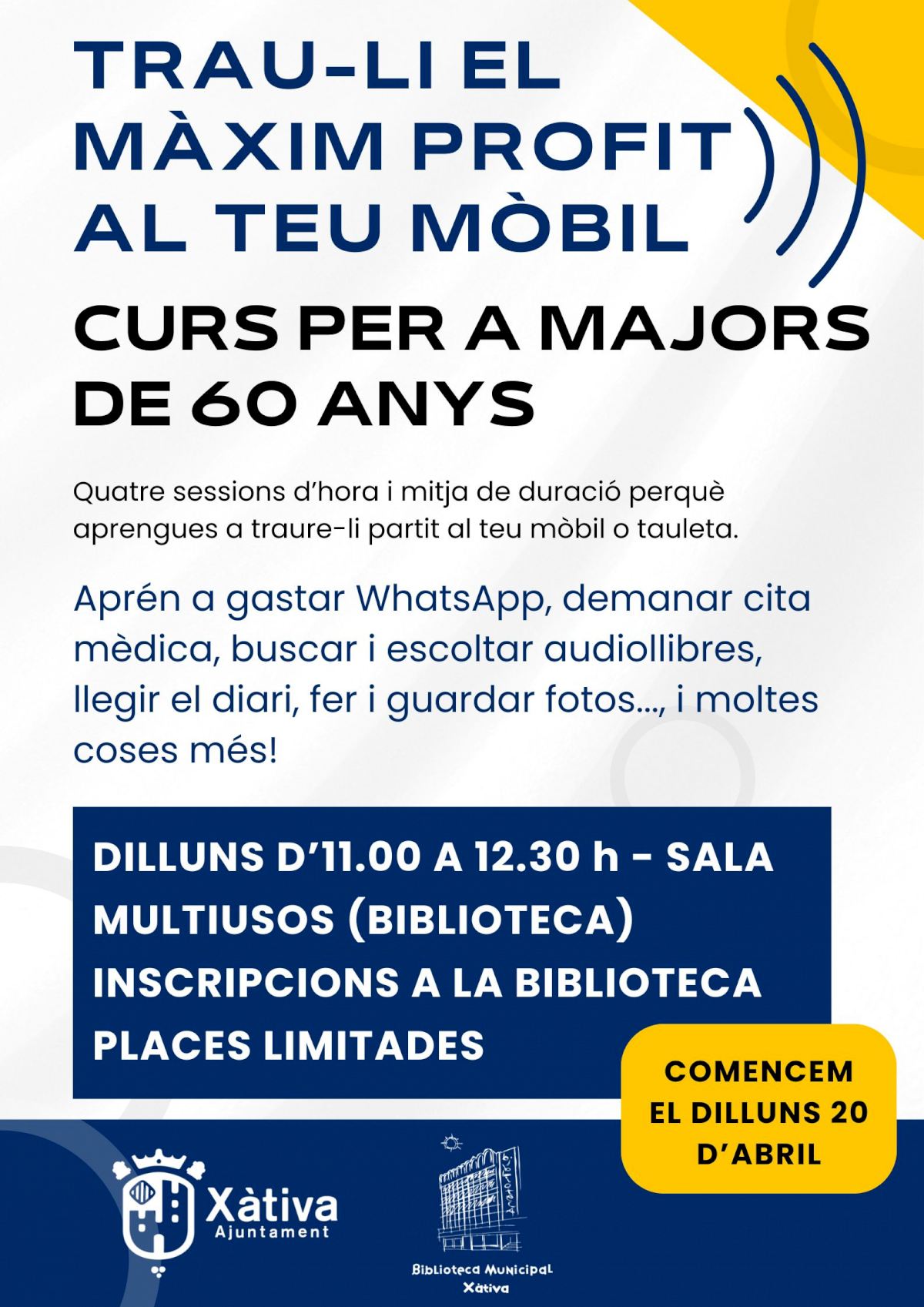 Por otro lado, el próximo 20 de abril se iniciará un curso de formación en competencias digitales dirigido a personas mayores de 60 años. El curso constará de cuatro sesiones que se impartirán cada lunes, de 11:00 a 12:30 horas, en la Sala multiusos de la Biblioteca. Las plazas son limitadas y las inscripciones deben realizarse presencialmente en la Biblioteca.