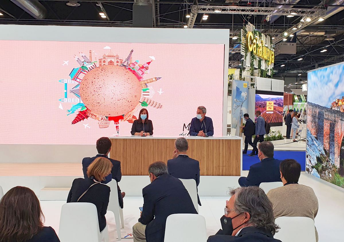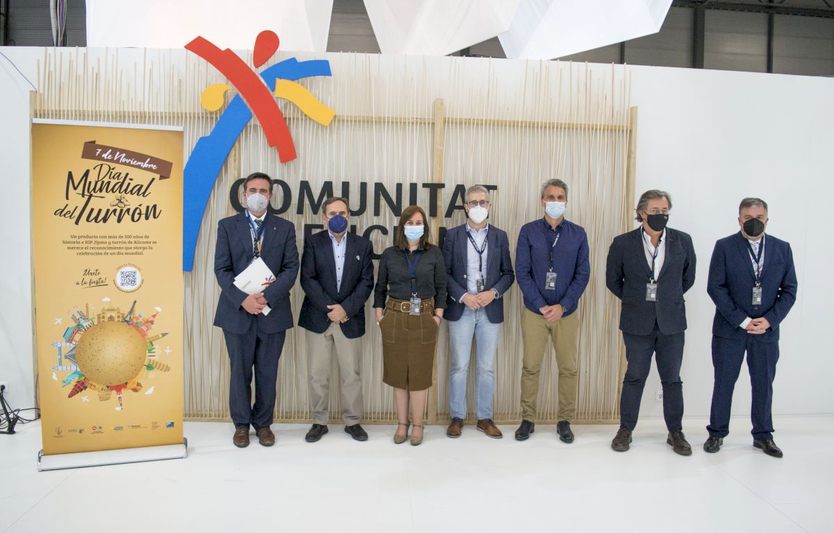 Al acto de presentación que ha tenido lugar en la plaza central del stand de la Generalitat Valenciana en Fitur, han asistido el director general de Turisme de la Generalitat, Herick Campos, el conseller de Política Territorial, Obras Públicas y Movilidad, Arcadi España, y el secretario general del Consejo Regulador de la IGP Jijona y Turrón de Alicante, Federico Moncunill, entre otros.